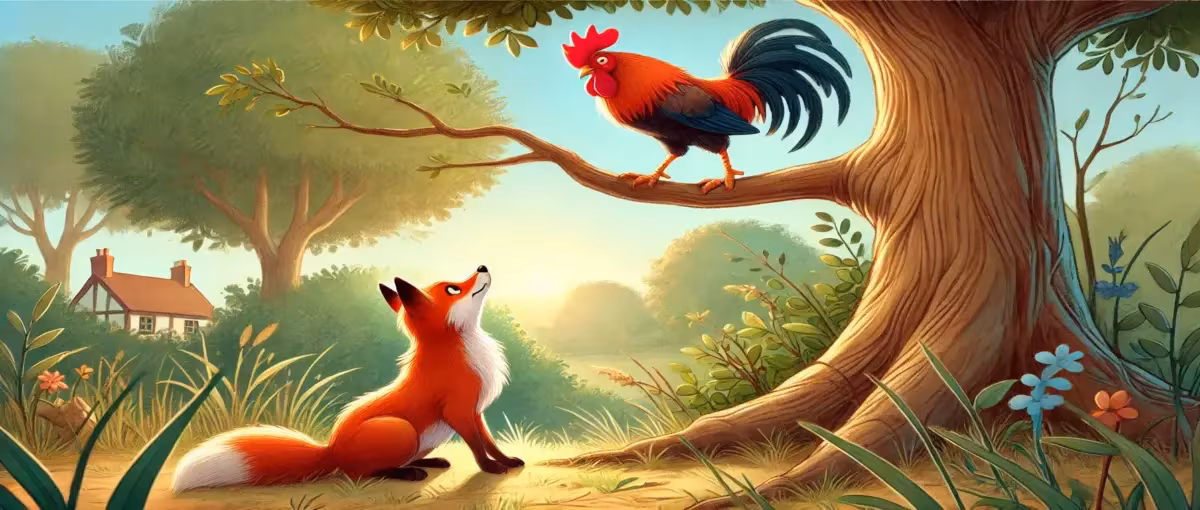 একদিন এক শিয়াল খাবারের সন্ধান করছিলো। এমন সময় সে একটি মোরগকে দেখতে পেলো। খাওয়ার জন্য মোরগটিকে ধরতে চেষ্টা করলো সে।