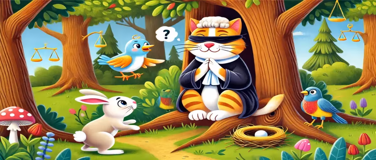 গাছের নিচে দুই চোখ বন্ধ করে ঋষির বেশে বসেছিলো একটি বিড়াল। পাখি ও খরগোশ সিদ্ধান্ত নিলো বিচারের দায়িত্বটি সেই বিড়ালকেই দিবে। খরগোশ এবং পাখি দুইজনেই একে একে বিড়ালকে তাদের সমস্যার কথা বললো।