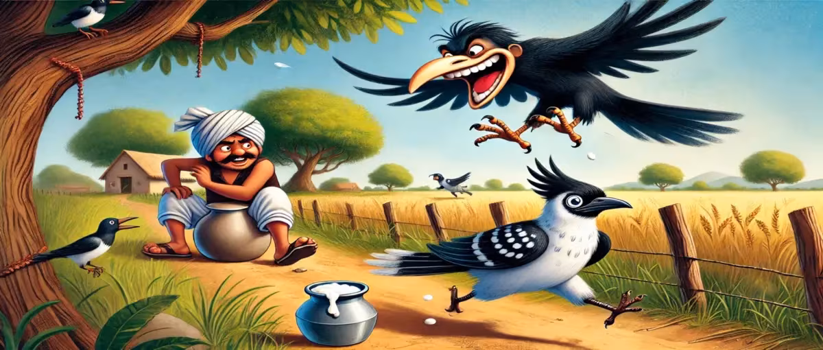 একদিন দুই বন্ধু , কাক ও কোয়েল একসাথে উড়ে বেড়াচ্ছিলো। উড়তে উড়তে তারা দেখলো, একটি লোক মাথায় করে দই নিয়ে যাচ্ছে।