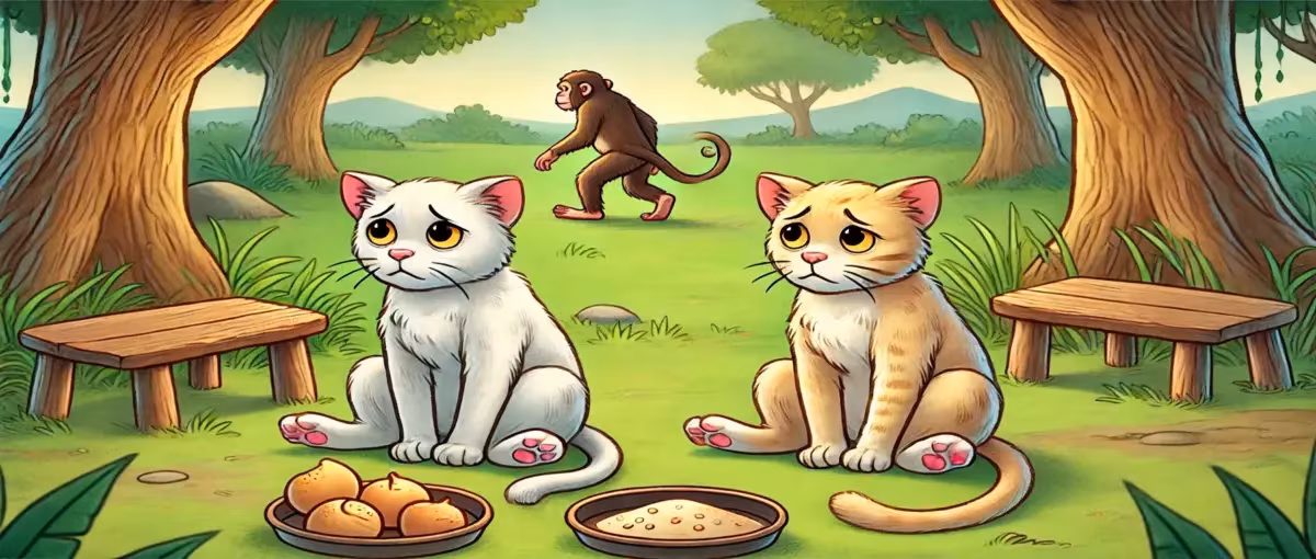 বড় টুকরোটি কে নিবে, এই নিয়ে বিড়াল দুইটির মধ্যে ঝগড়া শুরু হলো। এসময় পাশ দিয়ে হেঁটে যাচ্ছিলো এক বানর।