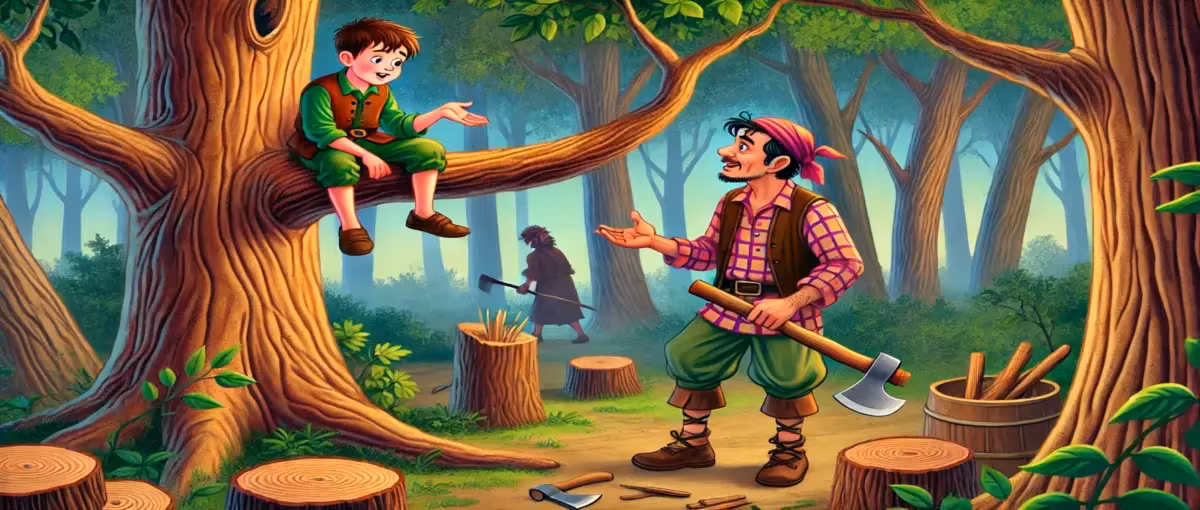 ছেলেটি কাঠুরেকে সাথে নিয়ে বনে গেলো। একটি গাছ উপরে বসে বোকা ছেলেটি কাঠুরেকে সেই গাছটি কাটতে বললো।