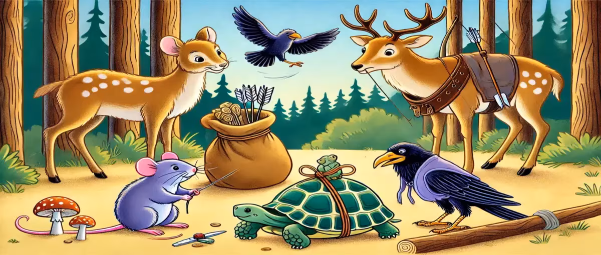 ইঁদুর, কচ্ছপ, হরিণ ও কাক চার বন্ধু। একদা হরিণ বন্ধুটি এক শিকারির ফাঁদে আটকা পড়লো। বাকি বন্ধুরা আসলো তার সাথে দেখা করতে। "দুশ্চিন্তা করোনা, বন্ধু। আমি তোমাকে মুক্ত করবো", ইঁদুর…
